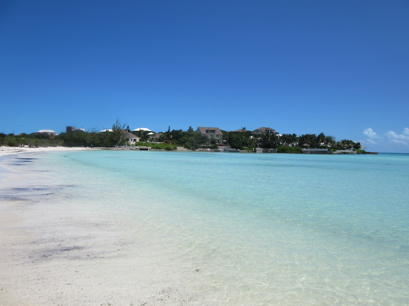 Taylor Bay beach. Not as nice as Sapodilla in my opinion. Some sea grass washed up on the beach. Less shade here. Some debris in the water. Someone built a nice sand castle. A couple arrives with their dog. Very few people here. Some nice homes in the area.