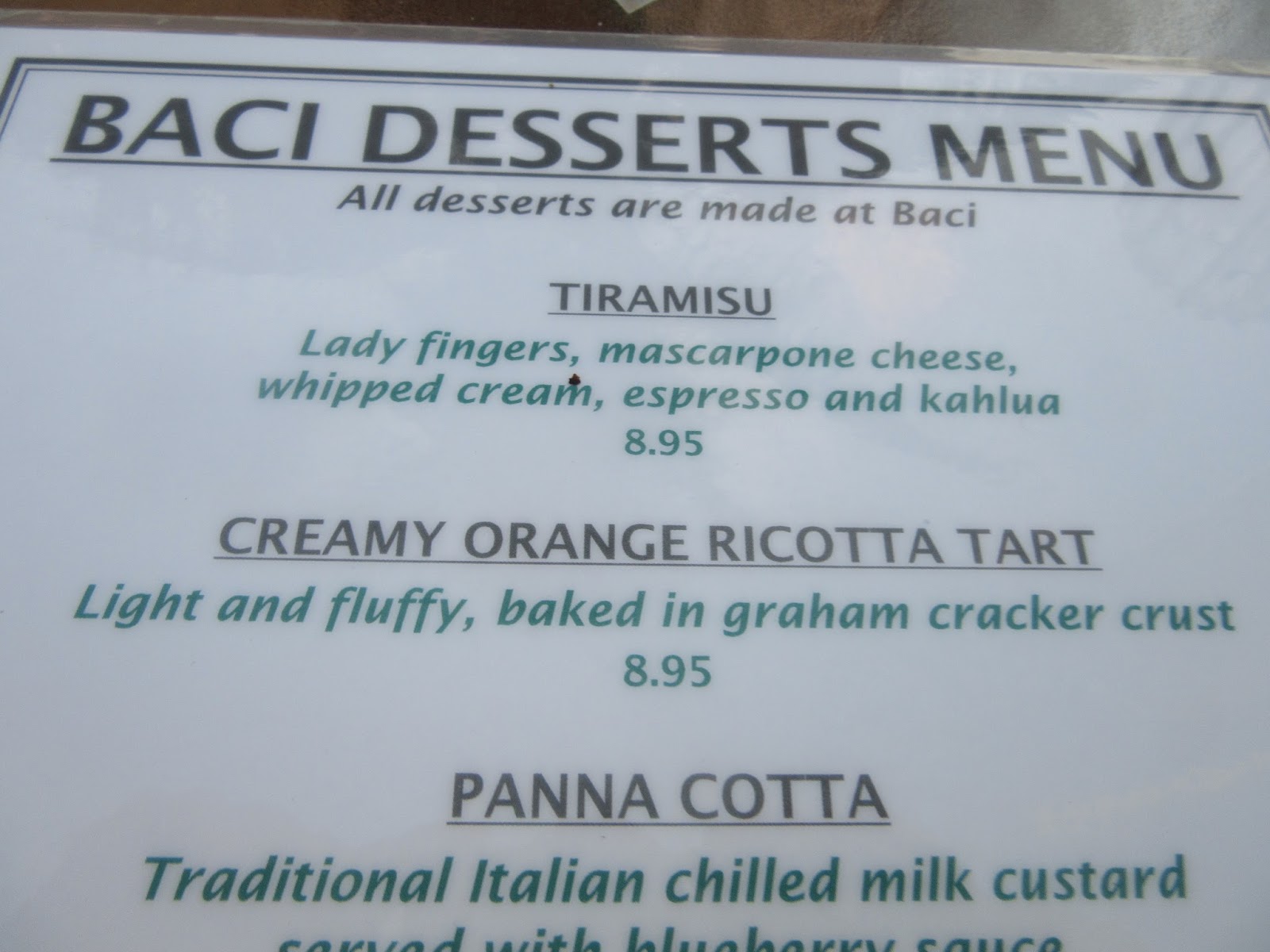 Dinner-next door-Baci. At the entrance we are greeted by the owner who escorts us to our table and tells us what the specials for the day are. We get a table for 2 right by the railing with a canal view. Shea is our server and does a great job. So far all the service we have received at various places has been top notch. Drinks-pina colada and Heineken. Basket of baguette slices. We split/share a salad of mixed greens in a house made balsamic vinaigrette dressing. Tasty. Richard orders one of the specials-fresh wahoo grilled with capers, onions, and tomatoes. Comes with jasmine rice and vegetables of broccoli, carrots, cauliflower, zucchini. This fish is perfectly prepared as all his other choices have been. Not overdone which is so important to him. I want Italian so I order the veal parmigiana and a side of homemade spaghetti. When my dish arrives I also get roasted potatoes and the same vegetables as Richard. I have a lot to eat! It was so good that I managed to finish every last bite sharing a bit of my spaghetti with Richard. The veal was so tender you could cut it with a fork. A generous portion also. Dessert-we share the tiramisu. Cost without tip $100.87